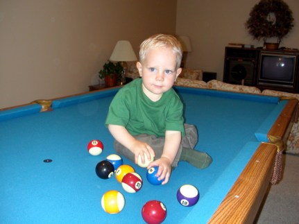 After Colin discovered the solar system, the pool balls at my parent’s home soon played their proper part. He liked to have ten balls in spin at once—the cue ball as the Sun, the teal-colored number 2 ball as Neptune, one of the striped balls as Saturn, and seven other balls taking turns as the other planets. We’d find him sitting cross-legged on top of the table with a ball in each hand—the other balls all around him spinning at declining rates. Removing him from this spinning world brought on a tantrum every time. No other toy could entice him away. When his grandfather bought him a toy truck, he turned it upside down to better spin the wheels, no motor sounds and pushing the truck around as expected. He went back to the pool balls. The spinning was all. The motion. The spheres.