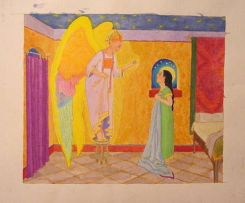 In an earlier painting before the disease crippled her hands, an angel with rainbow-colored wings appears before an astonished woman who clutches her clothes to her breast, as if she had been caught naked just out of the bath. The angel looms above her, the tips of its wings touching the ceiling of the room. The angel does not float or fly by supernatural means, but stands on a three-legged stool. Classic Nickle.